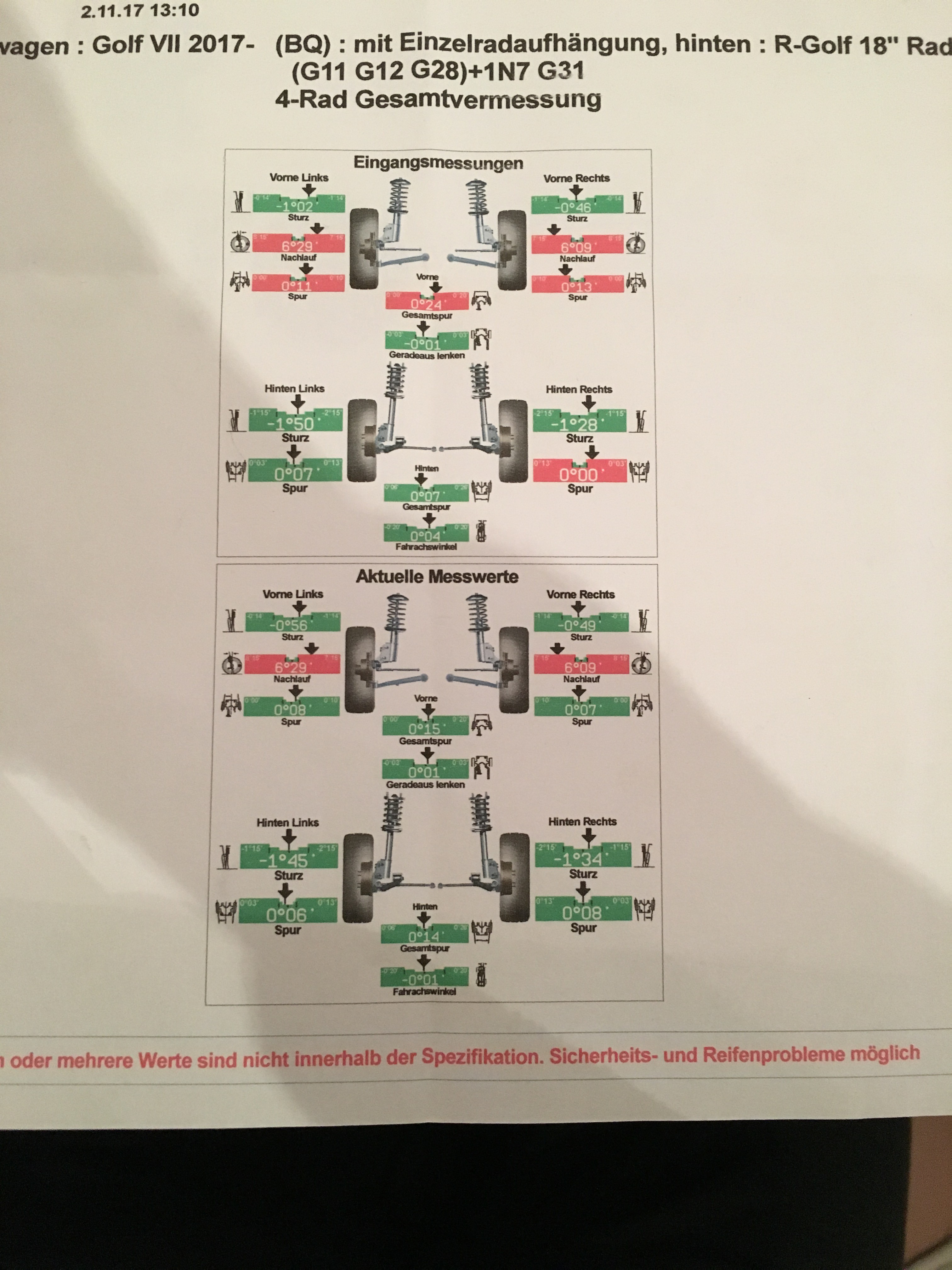 war heute bei VW um eine Achsvermessung machen zu lassen, hatte Vibrationen ab km/h 130 und Sägezahn an den Reifen.