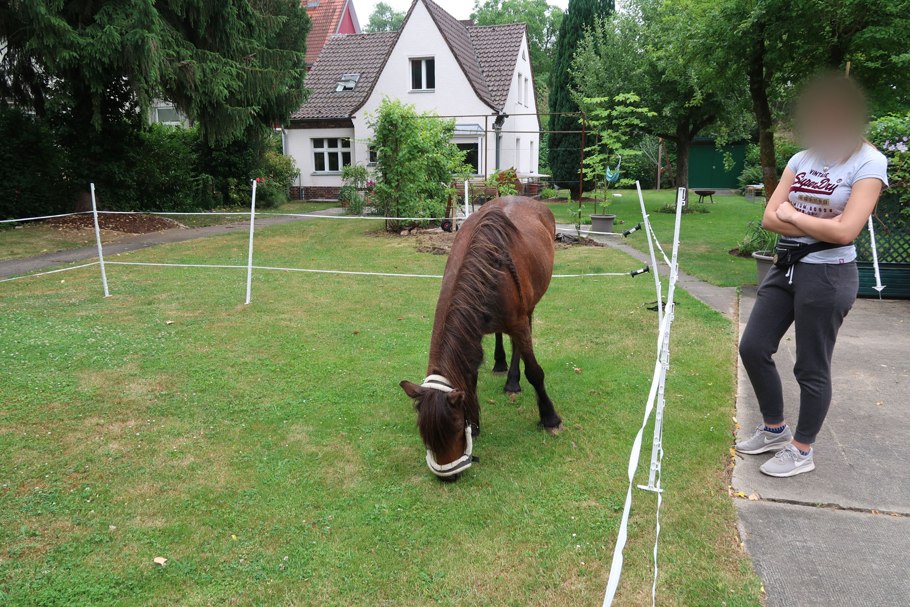 Gnadenpferd, seit Jahren schon hatte meine Tochter es im nahen Ponyhof umsorgt, es war und ist ihr Ein und Alles. Wir haben es gestern offiziell in unsere Familie aufgenommen, quasi freigekauft. Heute war es mal zu Besuch.