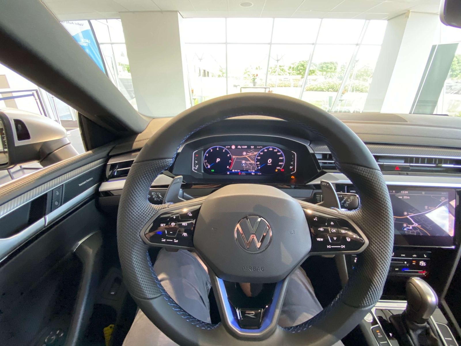 Das Lenkrad lässt sich deutlich besser und griffiger in der Hand halten als meines vom Golf 7 R und durch die matten R-Designelemente fühlt und sieht es sich edel an. Aber hier sprechen wir nur von einer Art steifen Hartplastik wie dies auch bei den Schaltwippen der Fall ist. Wirkt aber meiner Meinung nach absolut nicht Billig!