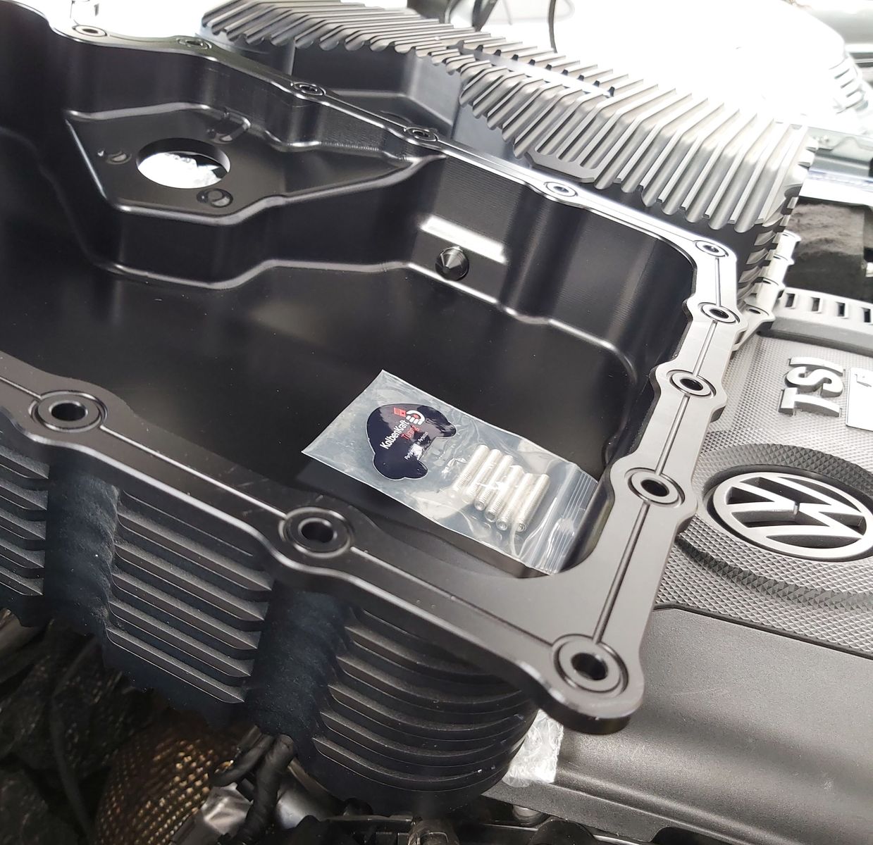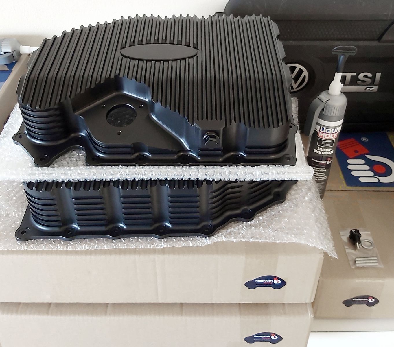 Egal, wo Ihr eine Alu Wanne holt ... Ihr investiert in notwendige Sicherheit. Im Falle eines Motoschadens bleibt das Öl im Motor und der Motor wird generell nicht so heiß, meist nur 105 - 110 Grad bei langer Volllast). Das Modell (7,5 L statt 5,5 L Ölmenge), das bei mir seid zwei Jahren verbaut ist, sieht so aus. Die originalen Schrauben sowie der Öl-Messstab passen plug&play. LiquiMoly Dicht. sowie alle Sensorschrauben sind dabei.