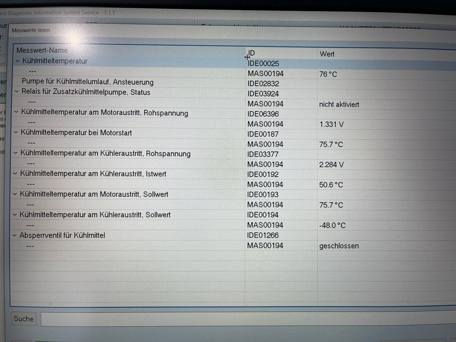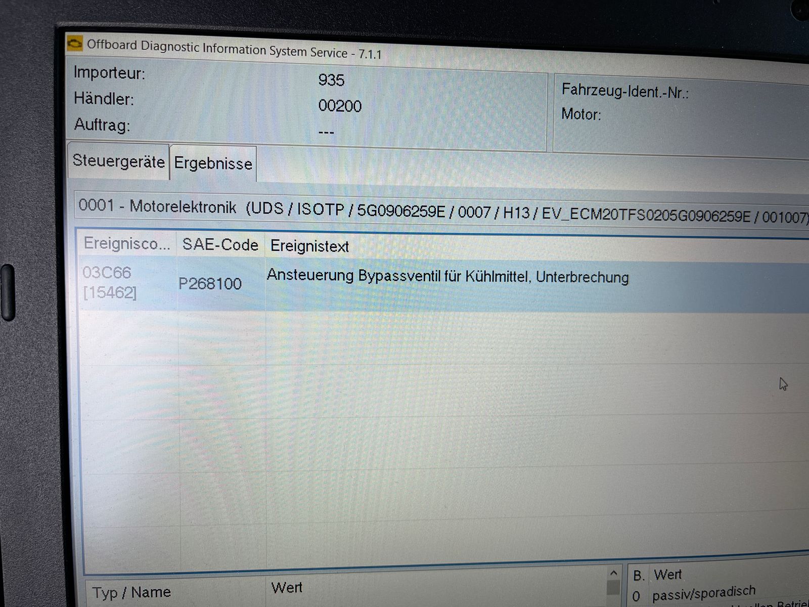 war heute Abend noch kurz einkaufen. Als ich auf dem Rückweg das Auto auf dem Parkplatz startete ging auf einmal die Motorkontrollleuchte an. Bin dann vorsichtig heimgefahren und habe gleich den Fehler ausgelesen. Im Motorsteuergerät ist P268100 - Ansteuerung Bypassventil für Kühlmittel, Unterbrechung - hinterlegt. Fehler lässt sich nicht löschen. Kühlmitteltemperatur war normal. Hatte schonmal jemand diesen Fehler?