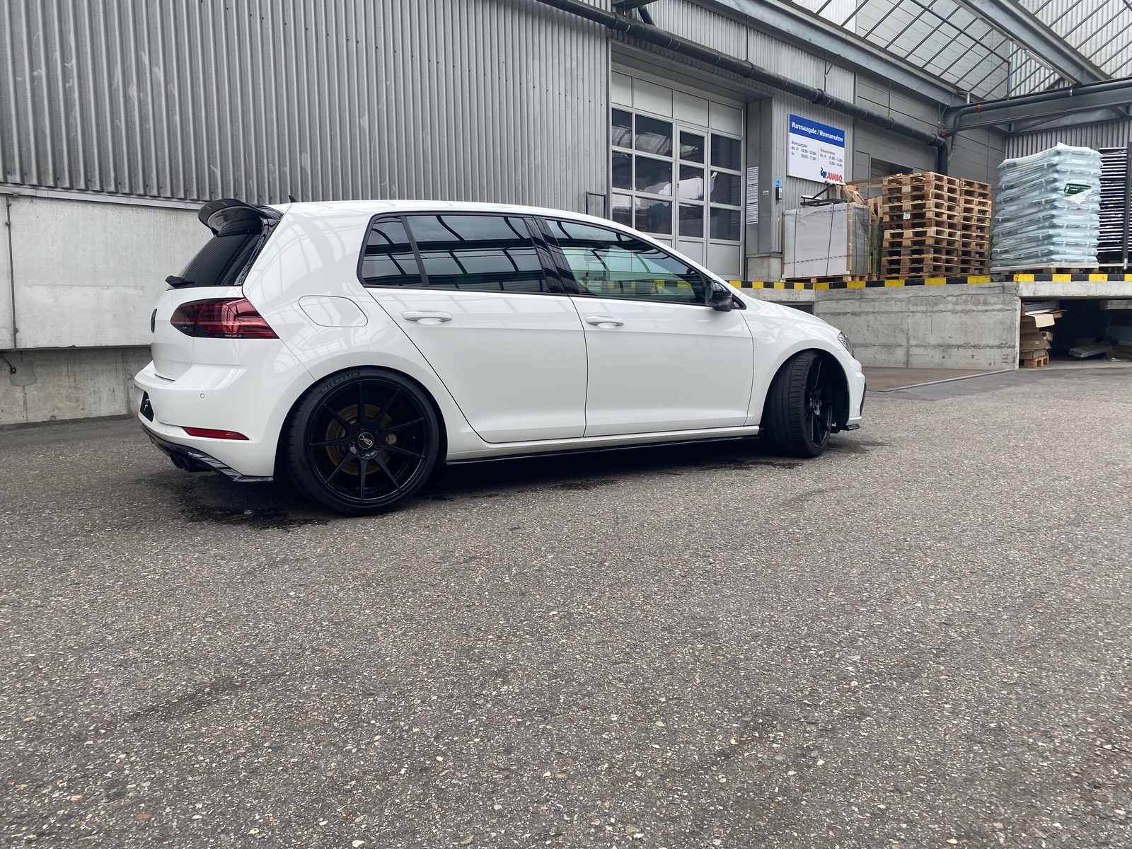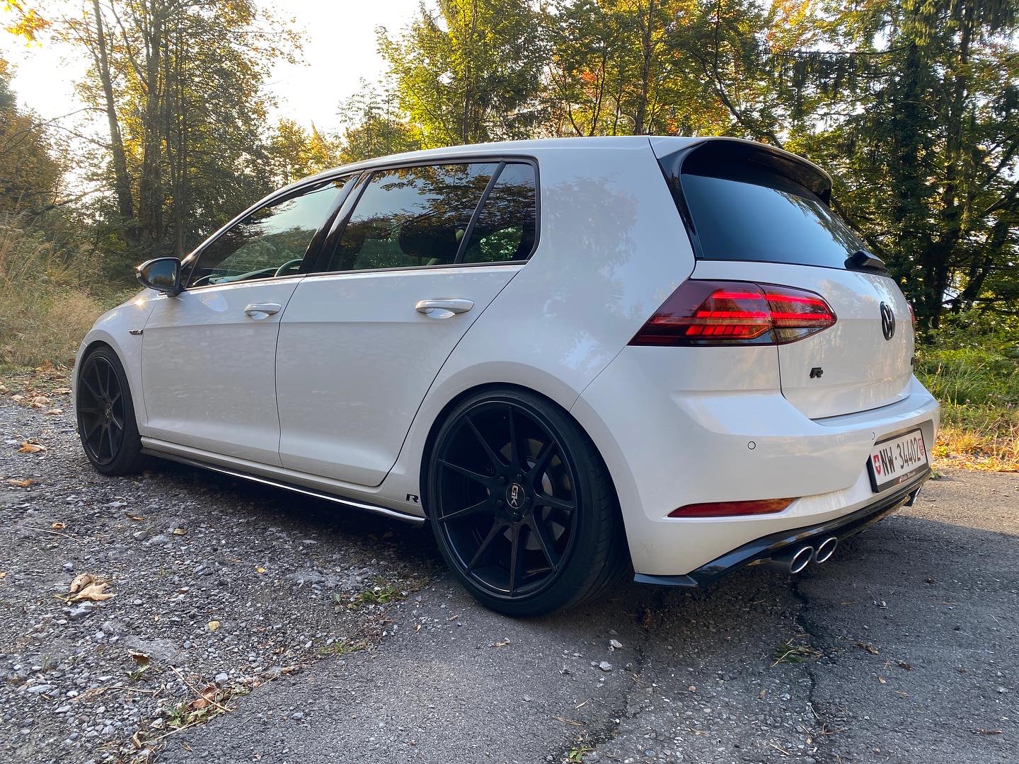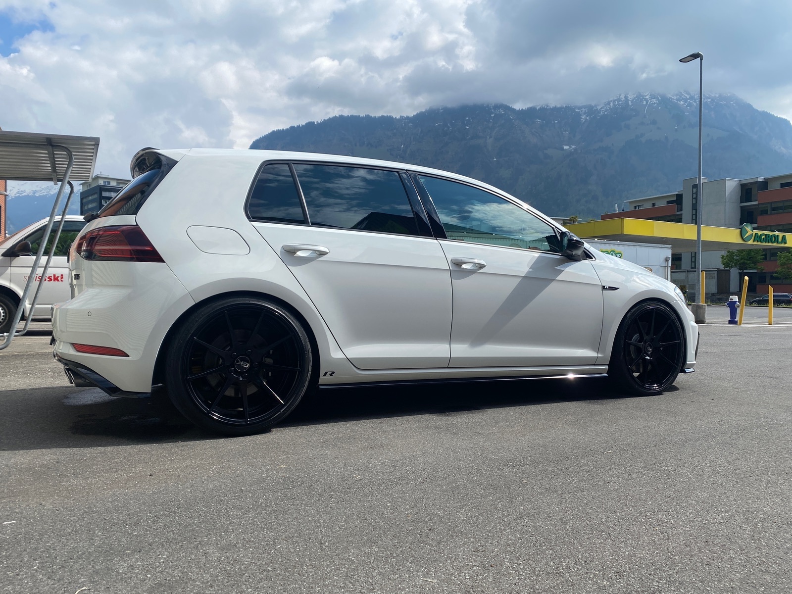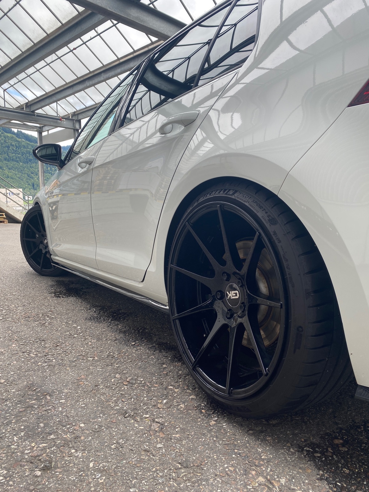11mm / Seite vorne und hinten. Hinten gar keine Probleme, nichts bearbeitet. Vorne streift es ab und zu leicht wenn der Wagen kurz ein federt. Dies aber nur vorne links und nur an der Kunststoffverkleidung. Fahre diese Felgen nur mit den Winterreifen, im Sommer sind die GK Felgen montiert und dann ohne Platten.