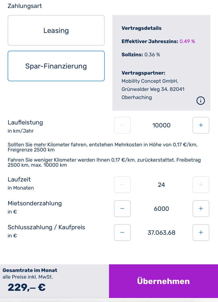 Bei einem aktuellen Beispiel kostet das Leasing 299€ im Monat und die Sparfinanzierung nur 172€, wenn man die Schlussrate noch ein wenig anpasst.