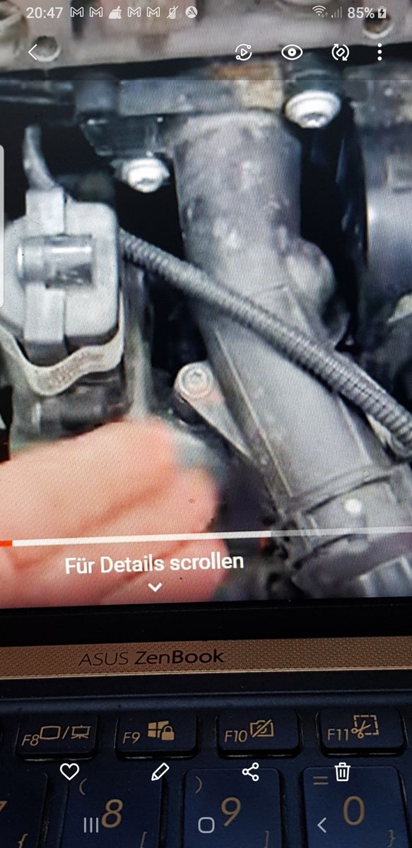 Ich habe die Tage n paar Wassertropfen auf dem boden gesehen,und sofort nachgeschaut wo die tropfen her kommen.Ich fand nichts.Also mit dem Endoskop gesucht und ich habe dann gesehen das da eine schraube an der wasserpumpe fehlt .Nur 2 statt 3 siehe foto 1 das ist mein Auto.Da fehlt eine Schraube wenn mann das Foto ansieht .Eigentlich logisch.