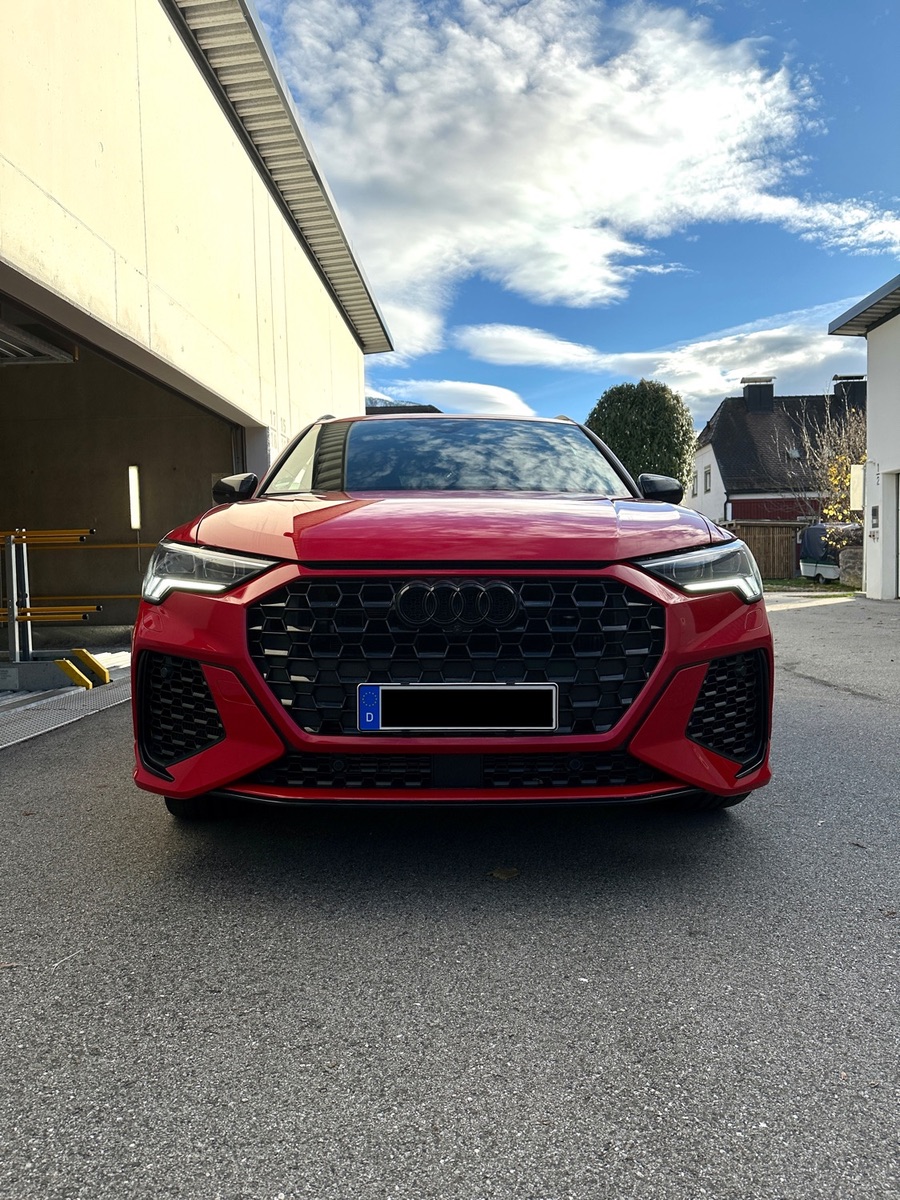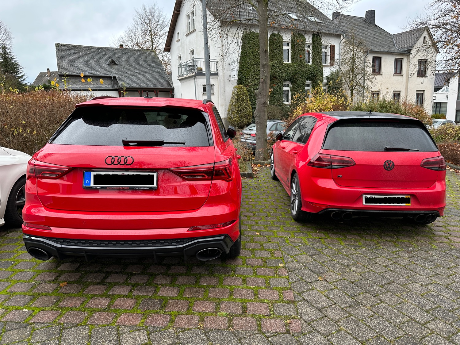 Nun was kommt jetzt. Ich steige auf den 2.5 Liter 5 Zylinder um. 400 PS und 4 Ringe. Richtig auf einen Audi RS3, aber keinen normalen sondern einen RSQ3. Tangorot Metallic (noch schöner als Tornadorot), 2 Jahre alt, 2500 Kilometer von einem Sammler, stand da wie neu. Genau das, was man aktuell bei den ganzen E-Fahrern braucht. ![]()
