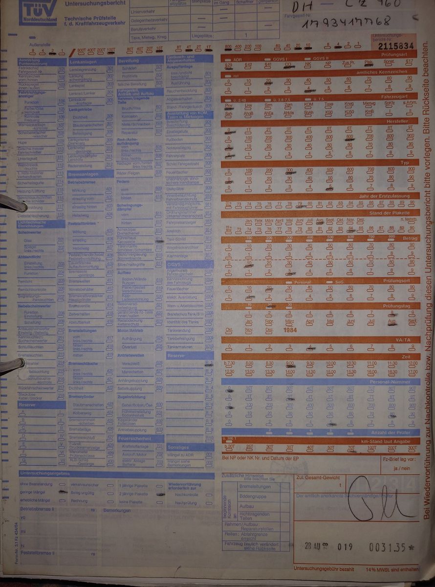 TÜV Prüfbericht, AU gab es noch lange nicht. Kosten 31,35 DM (16 €) ...