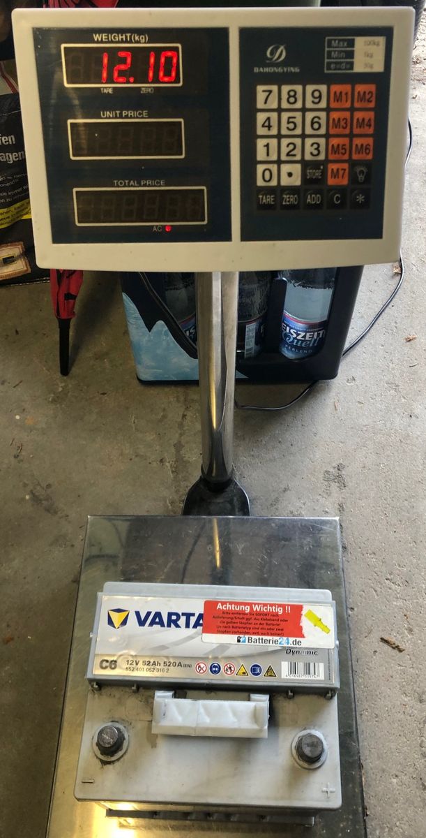 Die originale 69Ah EFB Batterie in unserem Bj. 2020 T Roc R wiegt 19,75kg.