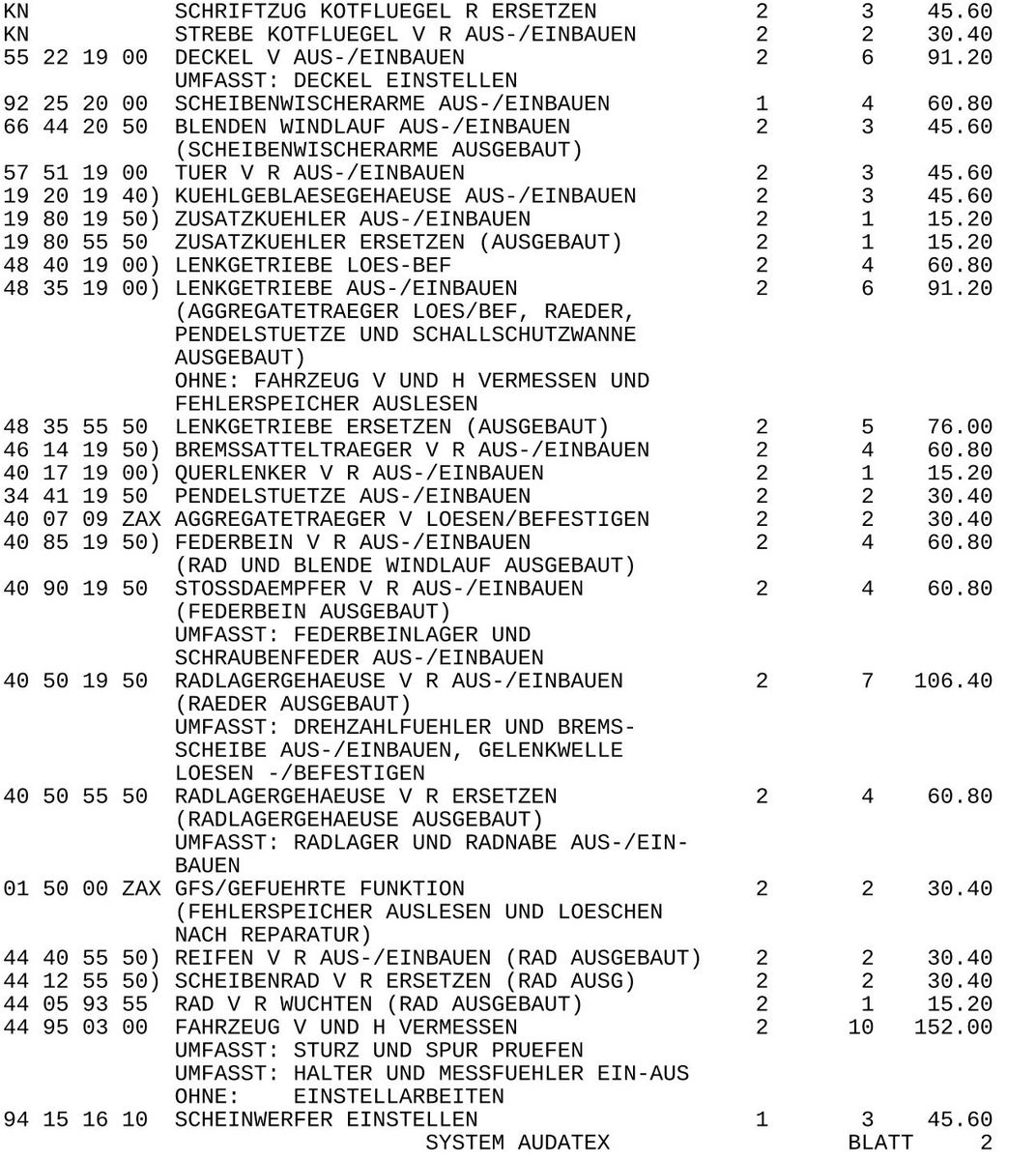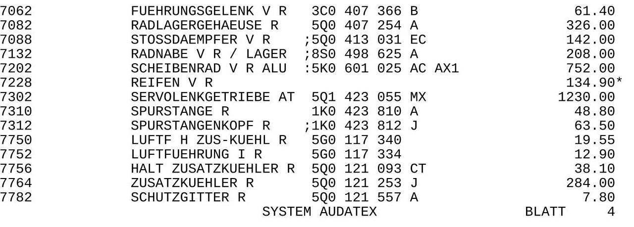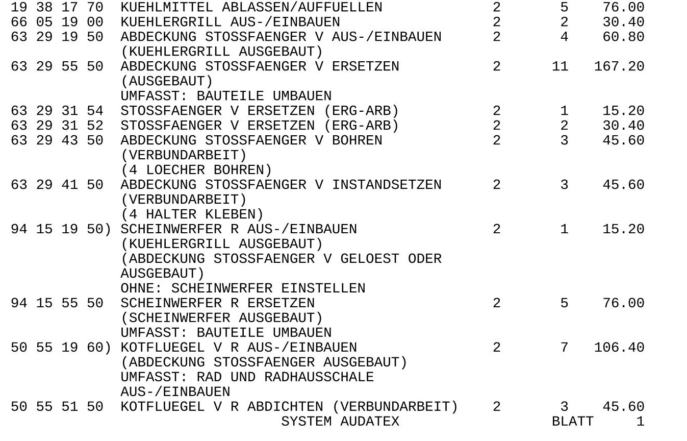 Gewechselt wurden Stoßfänger, Scheinwerfer + Steuergerät, Querlenker, Radlagergehäuse, Radnabe, Stoßdämpfer, Felge, Lenkgetriebe, Spurstange, Ladelustkühler, Hubzylinder der Scheinwerferwaschanlage, Ladeluftkühler und sämtliche Lackierarbeiten.