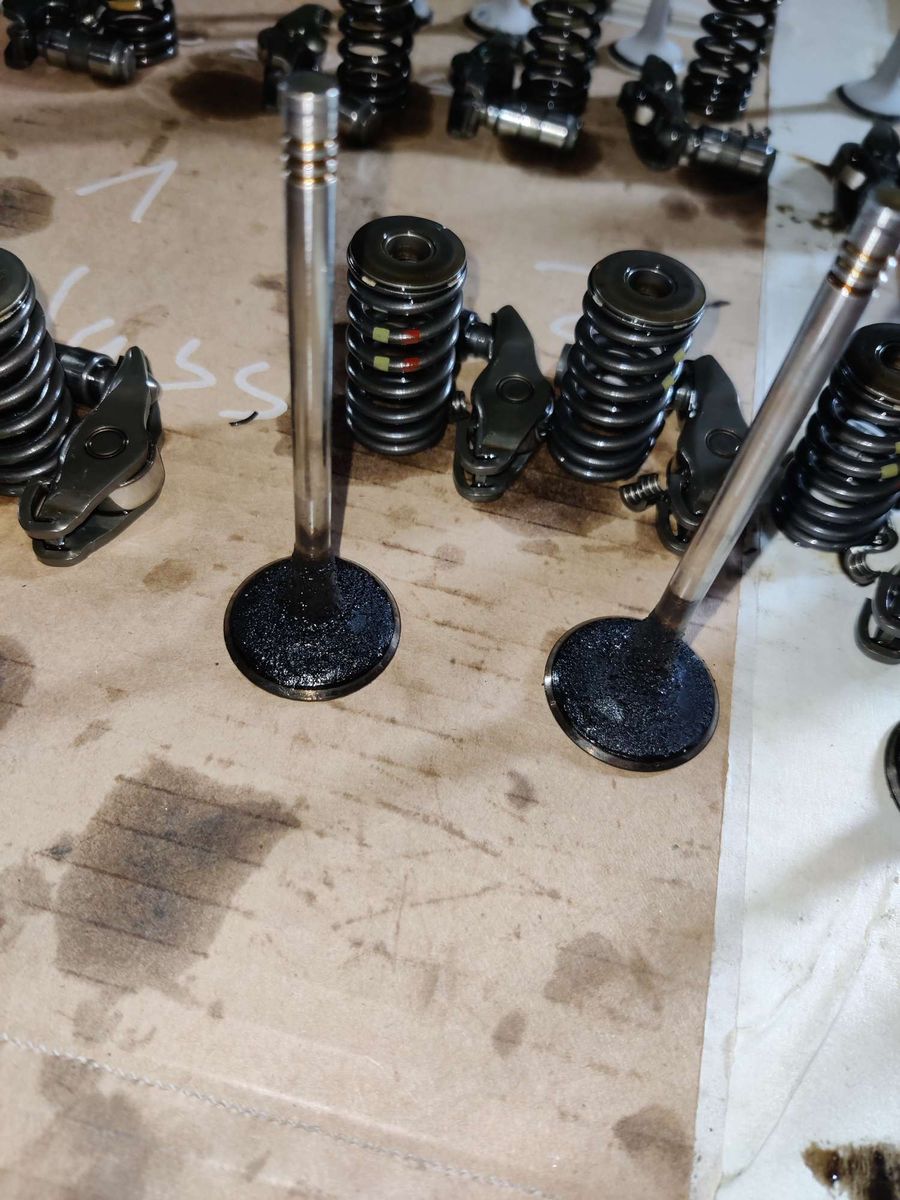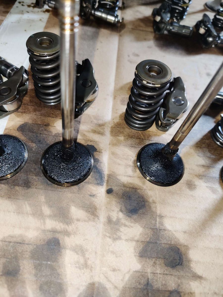 Während der Motorblock beim Motorenbauer war habe ich den Zylinderkopf gereinigt (Vor allem die Einlassventile) und neue Ventilschaftdichtungen montiert. Zugleich wurden auch alle Ventile von Hand neu Eingeschliffen.