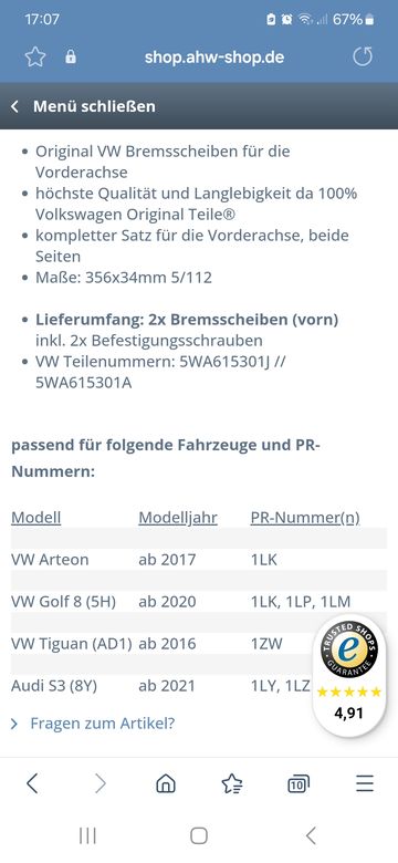 Finde hierzu aber nirgendwo die PR Nummer für die Bremsen.