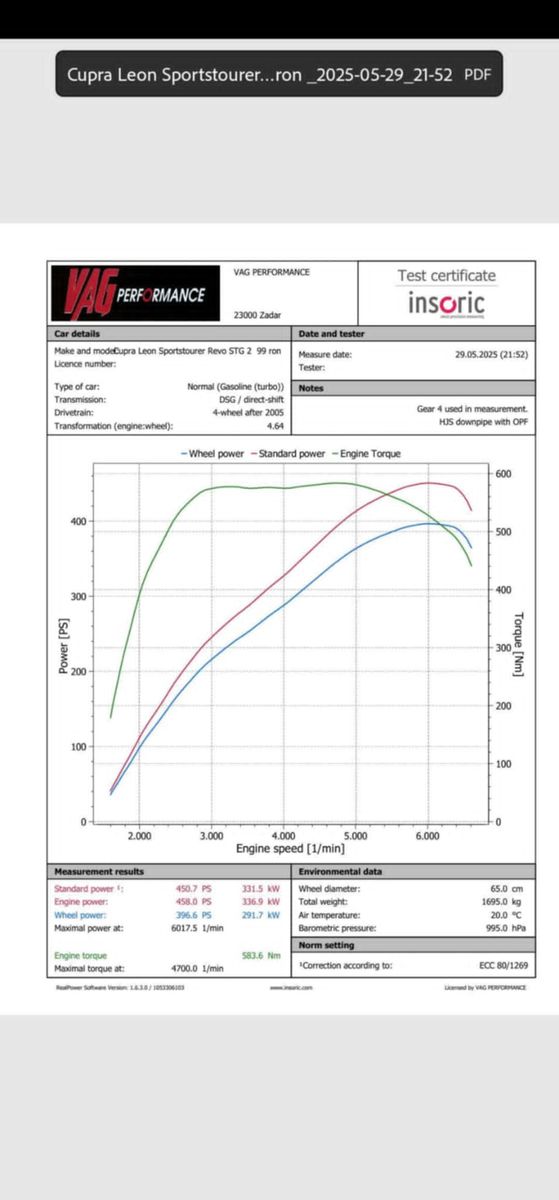 Moin, es handelt sich zwar nicht um den Golf R, aber um den ähnlichen Cupra Sportstourer St 310 ( mit Optimierung knapp unter 400 ).