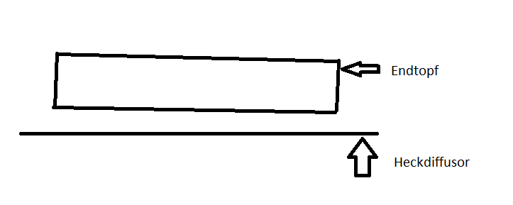 Das andere Problem ist, dass die Endrohre auf der rechten Seite etwas weiter rausgucken als die linken. Jetzt könnte man natürlich denken, dass man die Endrohrblende rechts löst, reinschiebt und fertig – ABER scheinbar hängt der Endtopf nicht parallel zum Stoßfänger (siehe Zeichnung, etwas übertrieben dargestellt), weswegen man die Blende nicht einfach weiter reinschieben kann. Die einzige Möglichkeit wäre es, den Endtopf links zu lösen und in Richtung Heckschürze zu ziehen, damit Endtopf und Heckschürze parallel zueinander sind und die Endrohrblende links weiter rauskommt. Theoretisch wäre es möglich, da ich die linke Seite des Endtopfs in der Höhe und in der Längsachse verstellen kann. Allerdings klappt das mit der Verstellung in der Längsachse einfach nicht, da dann die AGA den Haltegummi einfach wegdrückt und dadurch wieder exakt gleich sitzt.
