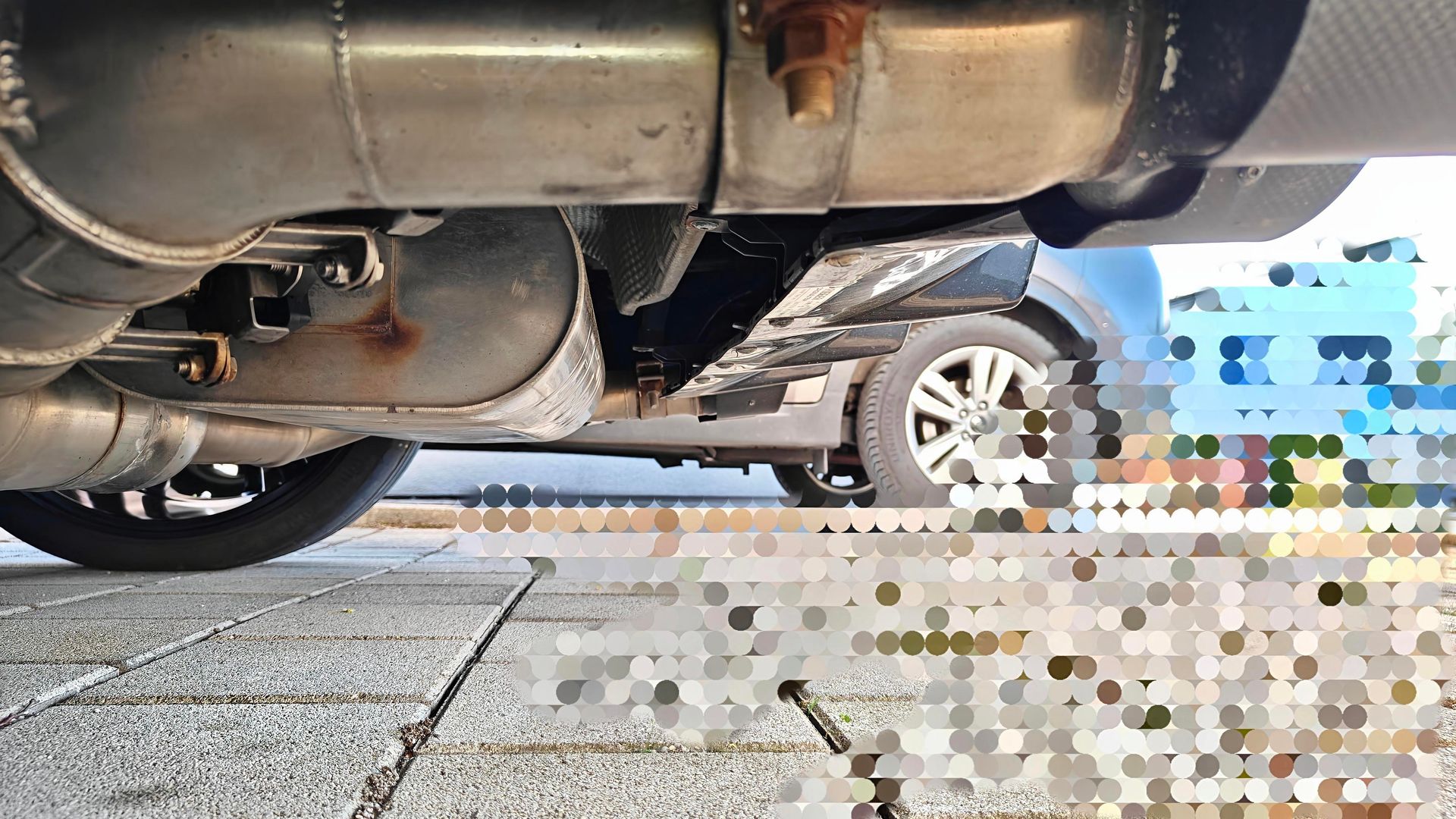 Einerseits ist es die Höhe der Endrohre links und rechts. Obwohl die Endrohre links/rechts von der Höhe (gemessen von Boden bis Unterkante Endrohr) gleich sind (geprüft auf einem ebenen Boden) und der Abstand Diffusor → Oberkante Endrohr auch gleich ist, hat das rechte Endrohr einen steileren Winkel zum Boden bzw. es guckt stärker Richtung Himmel als das linke. Man kann das nur ausgleichen, indem ich das rechte Endrohr am Endtopf löse und es vom Winkel her an das linke angleiche. Allerdings sitzt das rechte Endrohr dann viel zu tief, weswegen ich den Endtopf auf der rechten Seite hochschrauben muss. Dann sitzt der Endtopf auf der rechten Seite viel zu hoch, es sieht gaga aus und klappert wie Sau.