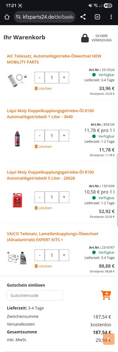 Ich habe mir folgende Teile rausgesucht und bereits im Warenkorb: