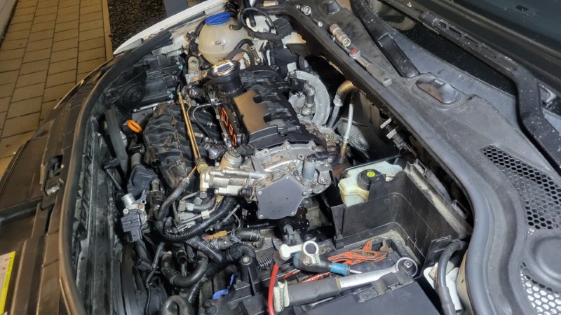 Zu Hause habe ich dann die Steuerzeiten Zahnriemen und Kette geprüft, im VCDS konnte ich 4° Phasenversatz auslesen. 7° sollten ein Zahn am Zahnriemen sein. Es hat soweit alles gepasst und ich hab alles wieder zusammengeschraubt und dann ist mir ein riesen Mist passiert. Ich startete den Motor. Der lief sofort an und es gab ein paar Klackergeräusche gefolgt von einem großen Knall. Gesamtlaufzeit war 1 bis maximal 2 Sekunden würde ich sagen.