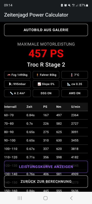 Ebenso kann man wie auf dem Dyno eine Leistungskurve mit Ps, Nm und Umin erstellen, dazu ist natürlich keine Bestzeit nötig sondern eine Messung zB only im 4. oder 5. Gang aus dem Keller bis maxx rpm und dort müssen die 10er Intervalle gemessen werden.