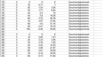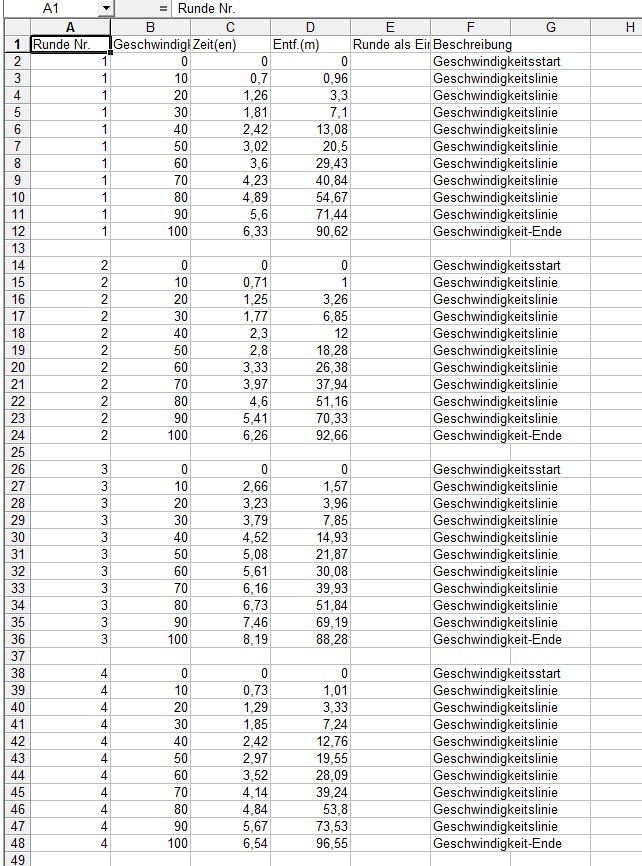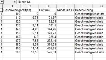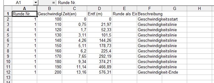 (ziemlich Ebene Strecke, bei 100 km/h 71,55 m, 1,42 m bergauf bis 147 km/h, dann 2,7 m bergab bis 200 km/h)