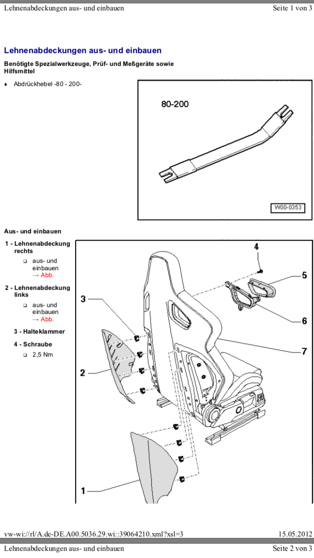 Also am besten Sitz ausbauen sonst kommt man an die lackierte Rückseite nicht dran da man die seitliche Kunststoff Verkleidung auf beißen Seiten abbauen muss ! Dazu das verstellrad der Rückenlehne ausbauen und den Griff der Höhen Verstellung dann hinten 2 Schrauben lösen der Rest ist eigtl nur geclipst und absolut selbst erklärend da könnt ich nichts falsch machen einfach machen war ne Sache von 30min da war alles zerlegt bei mir !
