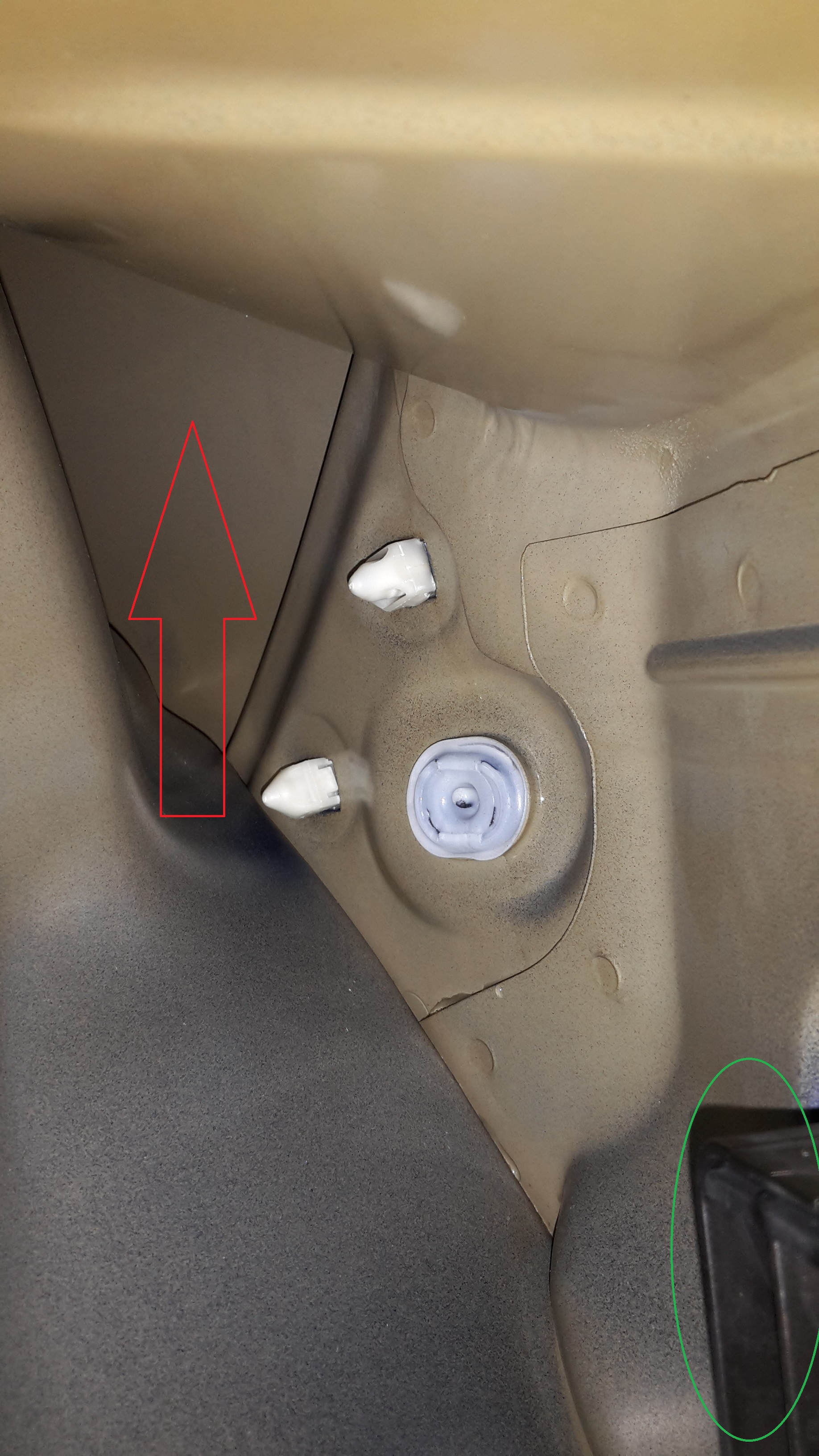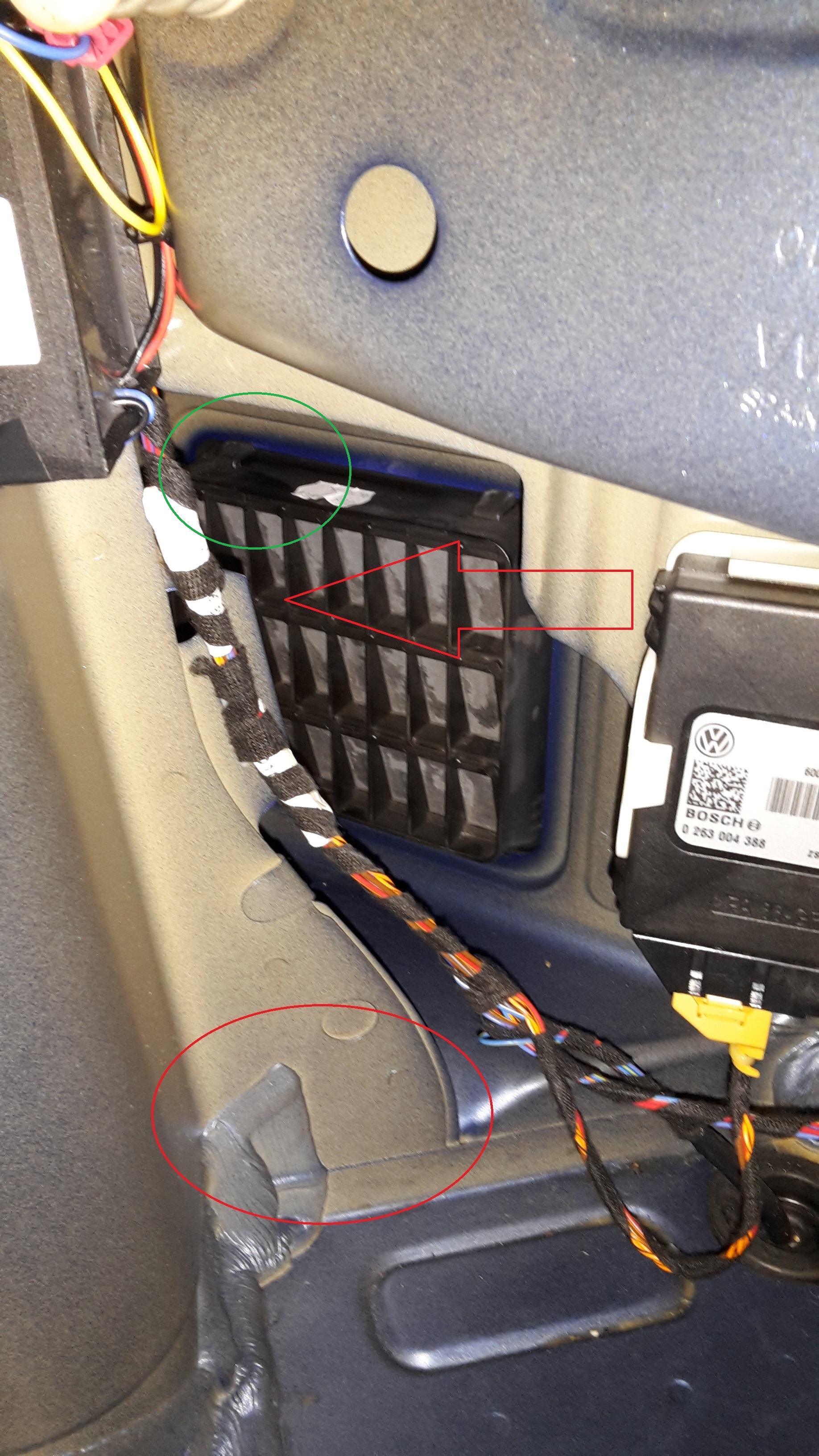 Das Bild zeigt die rechte hintere Seite des Kofferraums. Hinter dem oberen Blechteil mit dem Loch befindet sich die Rückleuchte. Hinter dem rot eingekreisten Blech sammelt sich das Wasser zu einer Pfütze. Irgendwann steht es dort so hoch, dass es in den Kofferraum und die Reserveradmulde läuft.