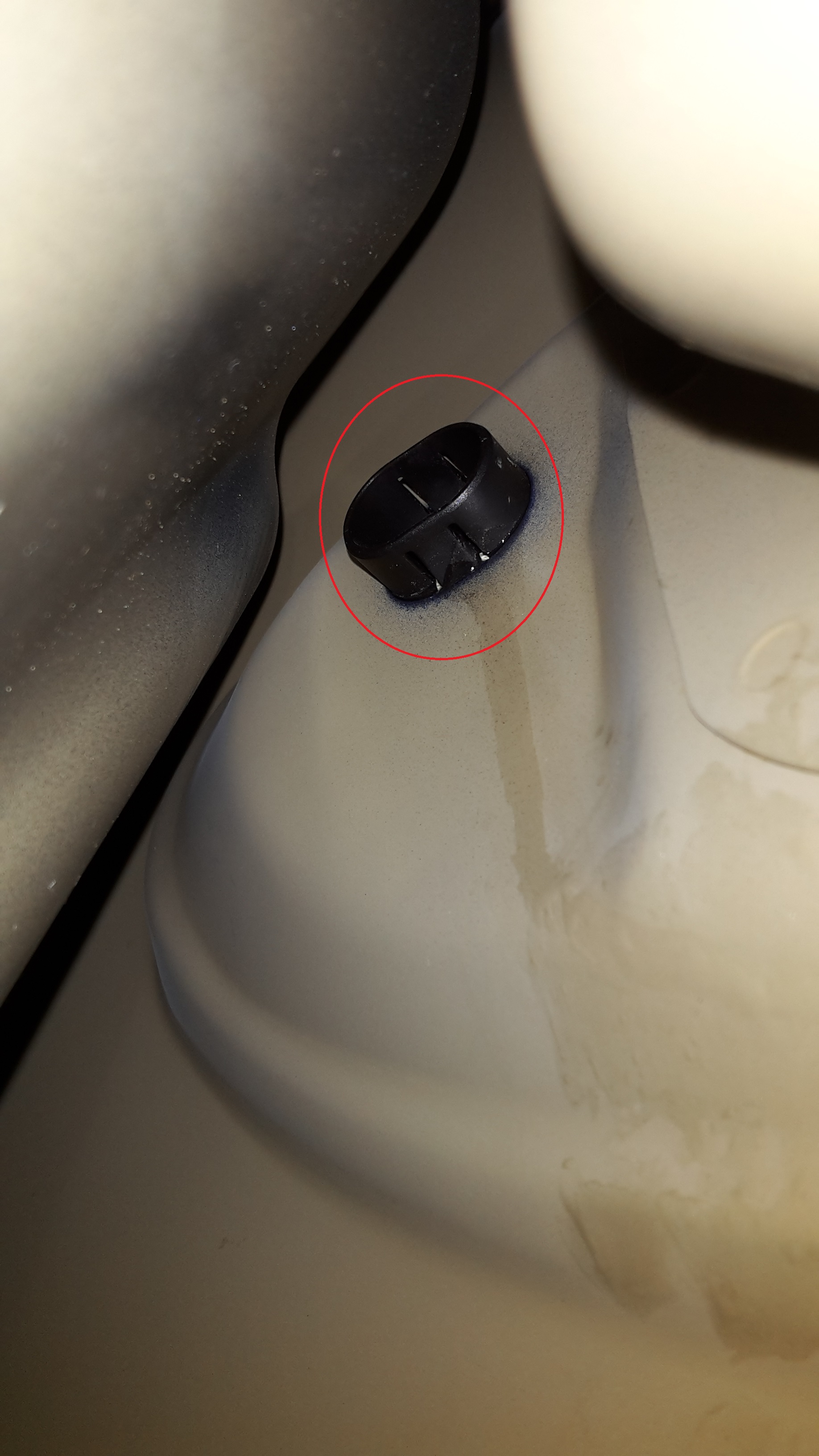 Ich nehme an, hinter der runden Form der Karosserie in der das Plastikteil steckt befindet sich der Tankstutzen. Das Plastikteil wiederum könnte zu der Kunststoffverkleidung des Tankstutzen gehören.