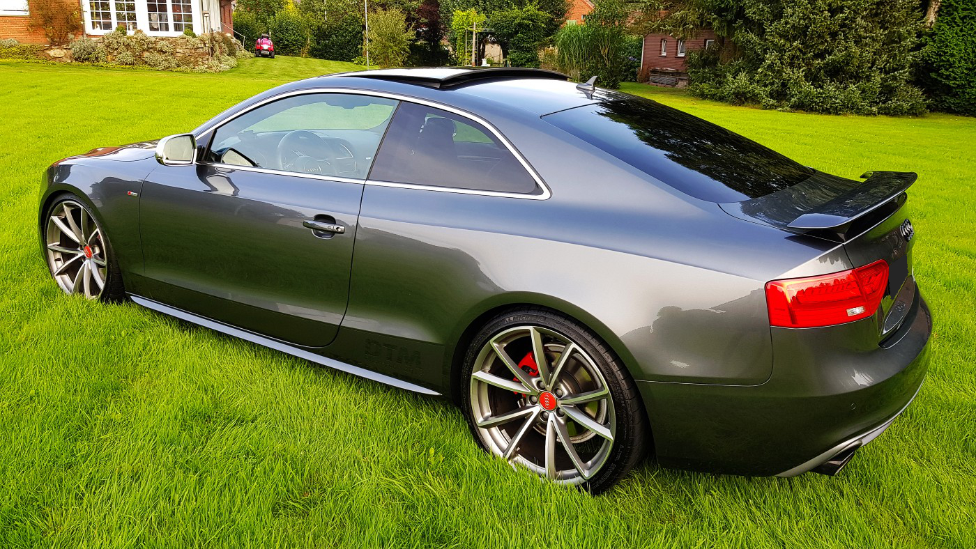 Auch die Felgen gefallen mir, ich hatte die gleiche auf meinem A5. Glanzschwarze Felgen würden das Farbkonzept natürlich fortführen ...