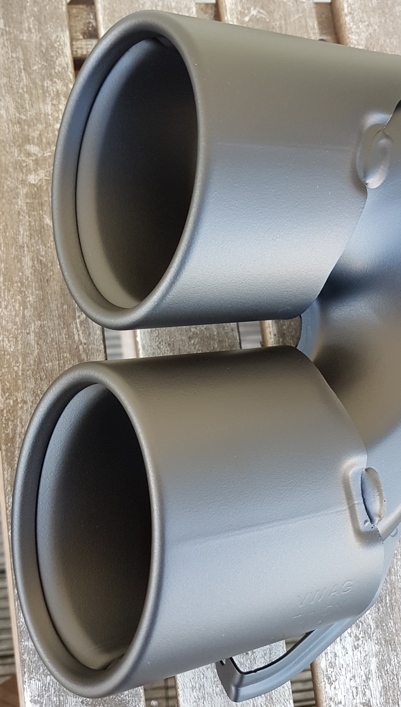 Meine Endrohrblenden am Variant wurden mit solch einem Pulver beschichtet. Das Pulver braucht eine etwas „gröbere“ Oberfläche damit es gut hält. Dafür soll es aber bis 500°C aushalten.