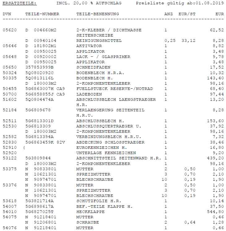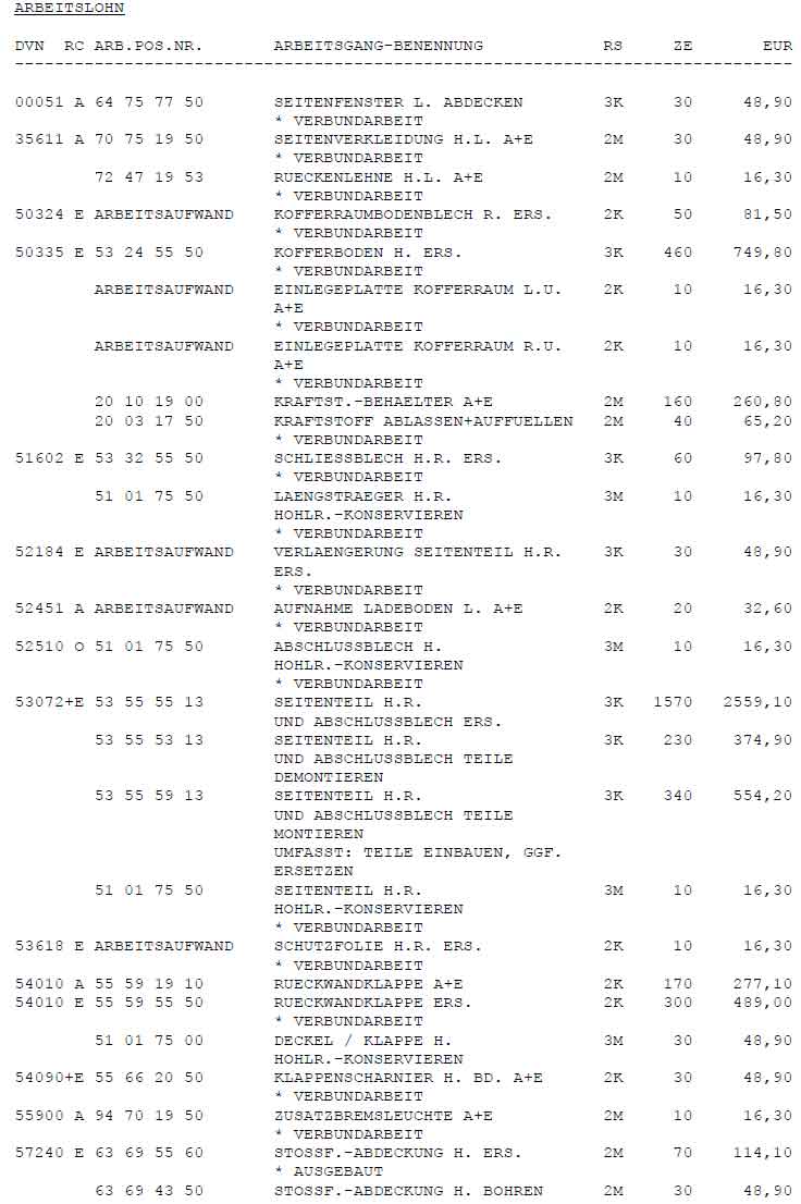 Einige Seiten "Kleinteile" + "gerade" ziehen + Lackieren + Arbeitslohn . Das Blech ist optisch nichtmal die wildeste angelegenheit bei der Sache gewesen...Als beispiel mal ein paar Sachen der Aufstellung aus dem Gutachten, die masse an positionen ist was im Endeffekt die hohen Gesamtkosten erzeugt: