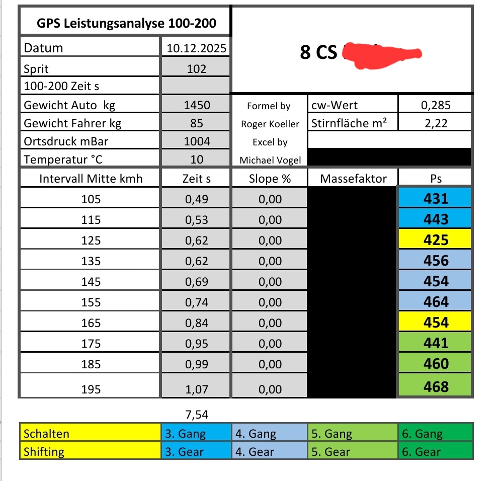 Ebenso kann man wie auf dem Dyno eine Leistungskurve mit Ps, Nm und Umin erstellen, dazu ist natürlich keine Bestzeit nötig sondern eine Messung zB only im 4. oder 5. Gang aus dem Keller bis maxx rpm und dort müssen die 10er Intervalle gemessen werden.