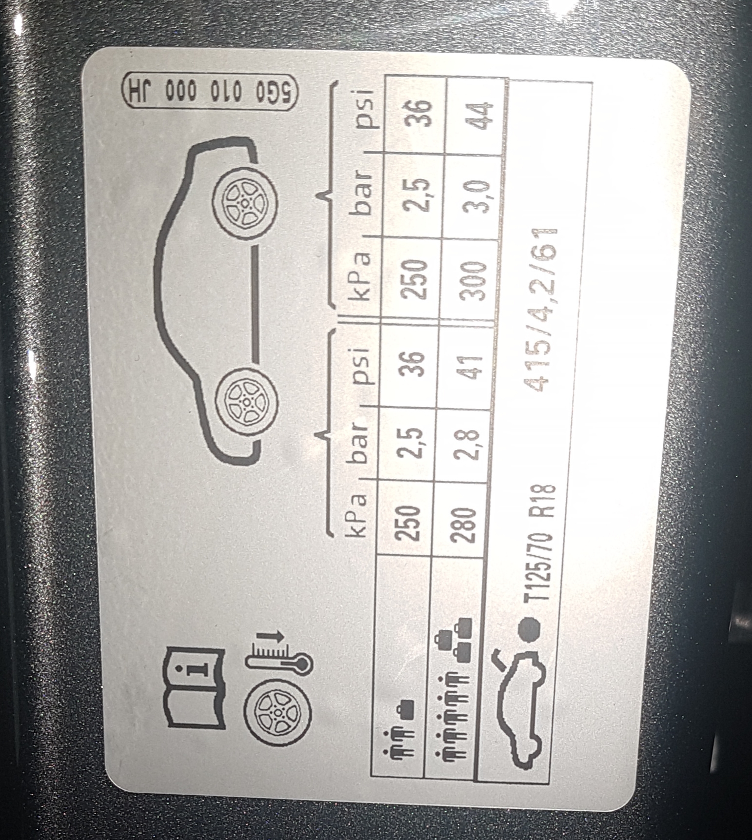 Auf der B-Säule habe ich folgenden Aufkleber. Hier wird nicht nach den verschiedenen Reifengrößen differenziert.
