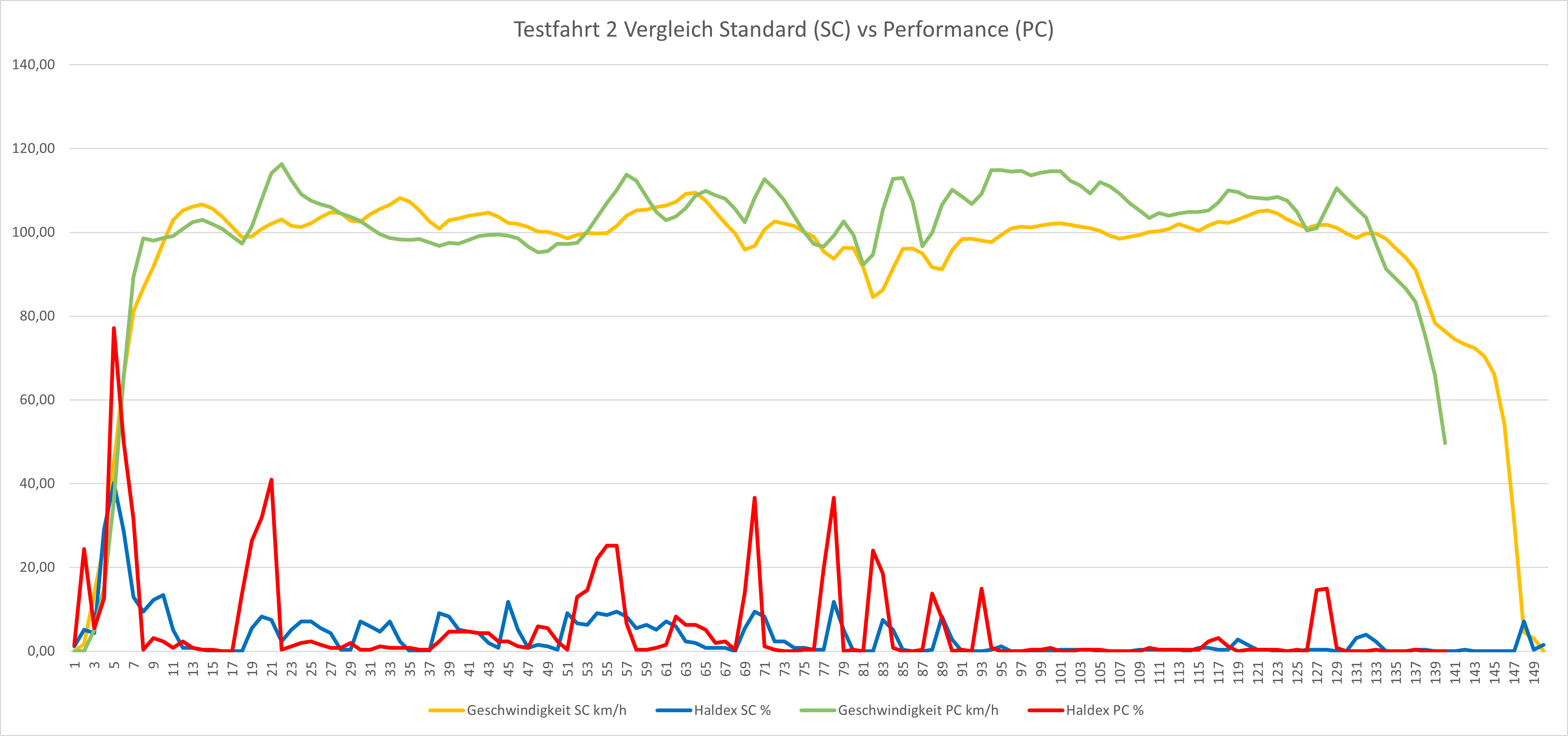 Hier nun die Ergebnisse der Testfahrten, die Abkürzungen SC steht für Standard Controller und PC für Performance Controller.
