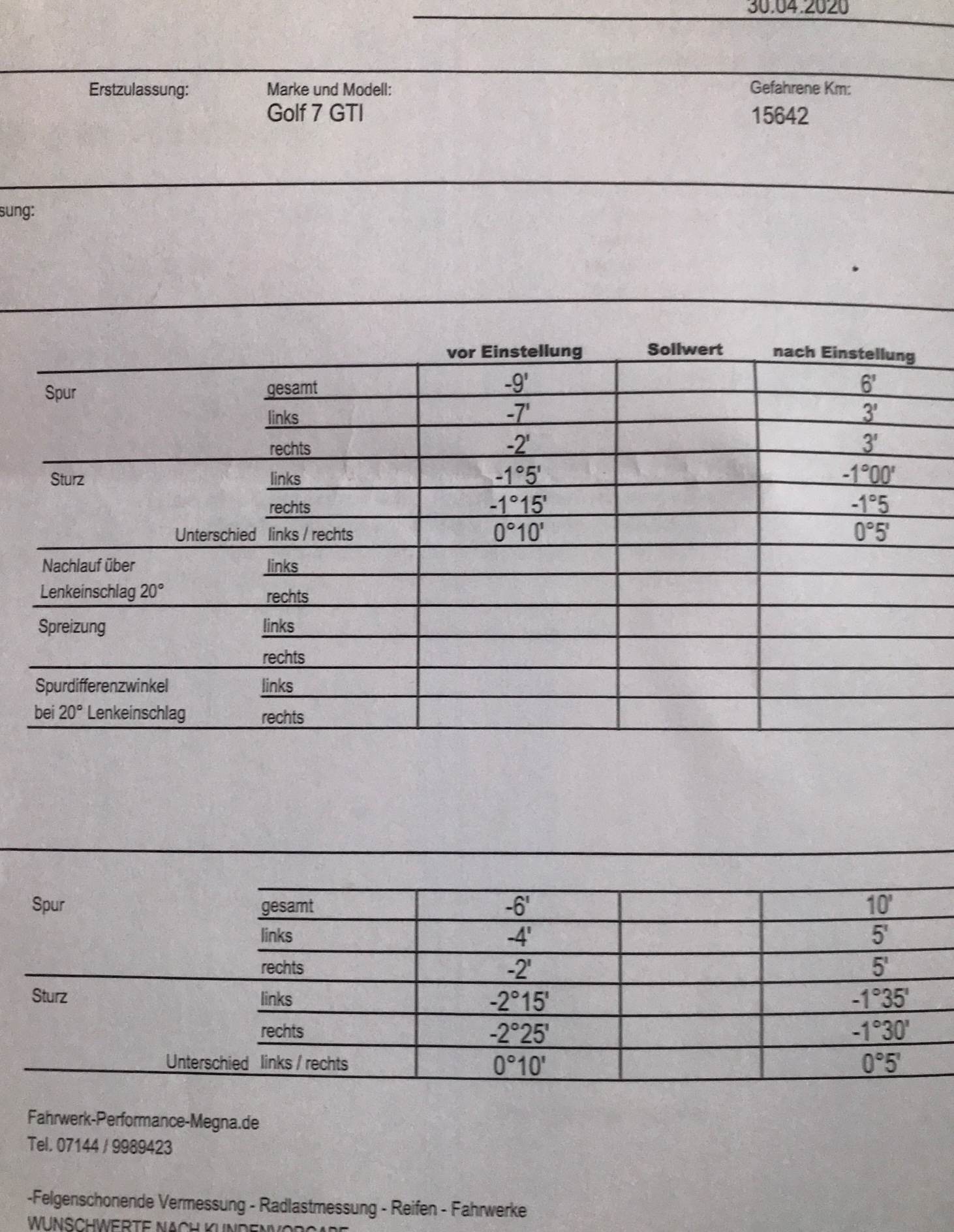 Leider ist nun mit meiner Rumstellerei die sehr ordentlich gemachte Achsvermessung für die Katz, Lenkrad steht nun ganz leicht schief, und eigentlich will ich auf beiden Achsen eh noch ein paar Minütchen mehr Vorspur haben.