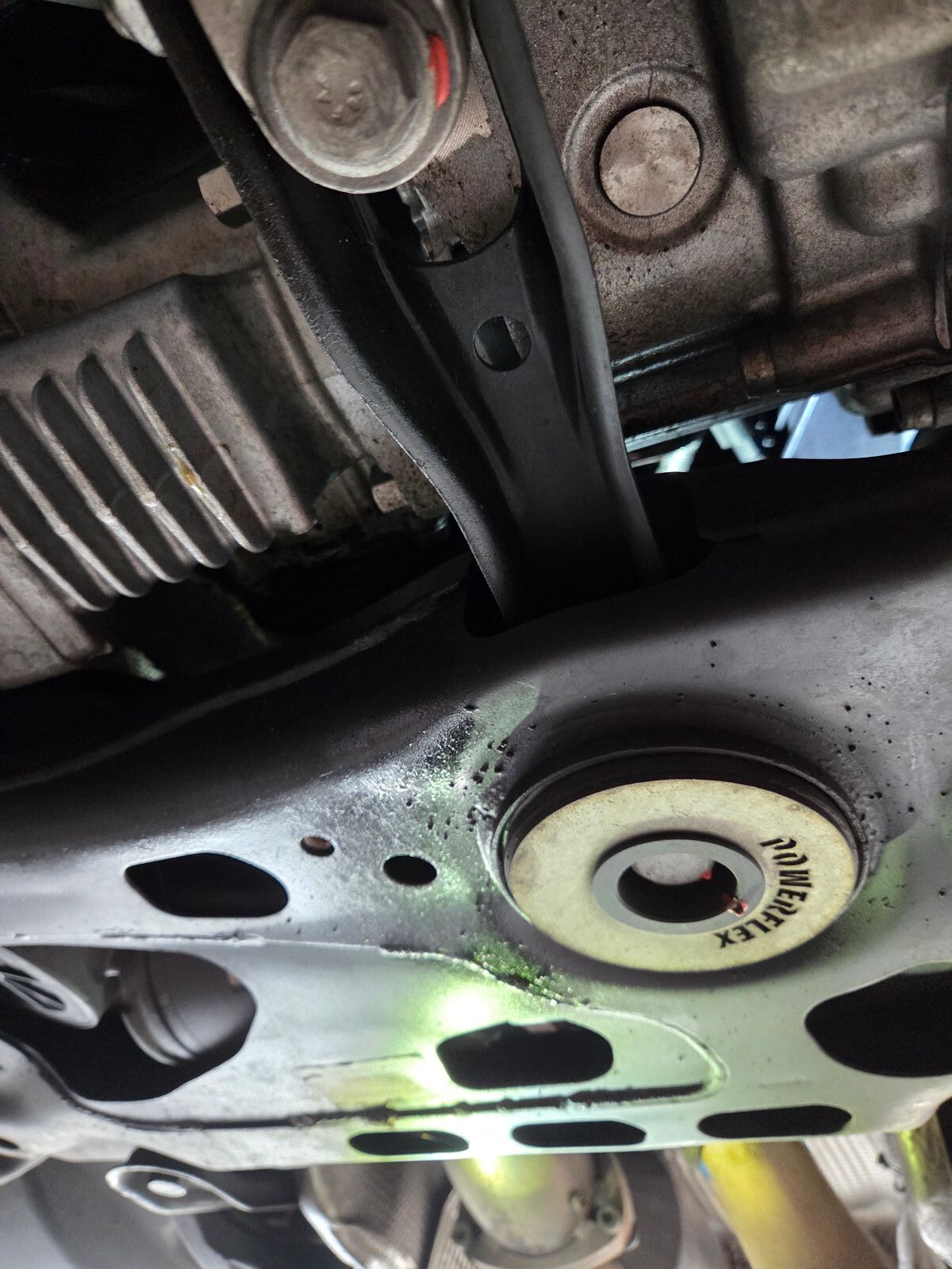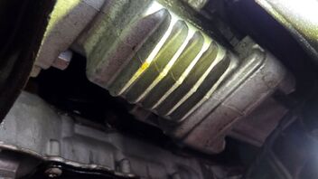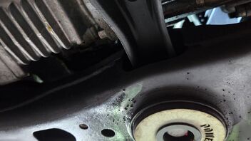 Die Bilder zeigen eine starke Verölung im unteren Bereich der Vorderachse. Da der Golf 7R Allrad hat, ist das vordere Differential Teil des DSG-Getriebes.