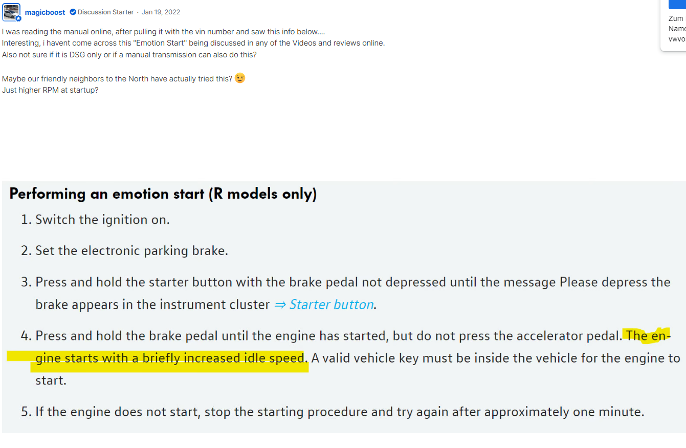 Ich grab das Thema nochmal aus..... Mit dem 20Years wurde offensichtlich ein Emotionsstart eingeführt. Jetzt habe ich durch Zufall in einem englisch/amerikanischem Forum einen Auszug aus der Betriebsanleitung eines 8R gefunden, die beschreibt wie man diesen Start einleitet. Der Beitrag ist von 01/2022. Man könnte also vermuten, dass dieses Feature bereits bei allem 8R integriert ist. Hat jemand mal probiert?
