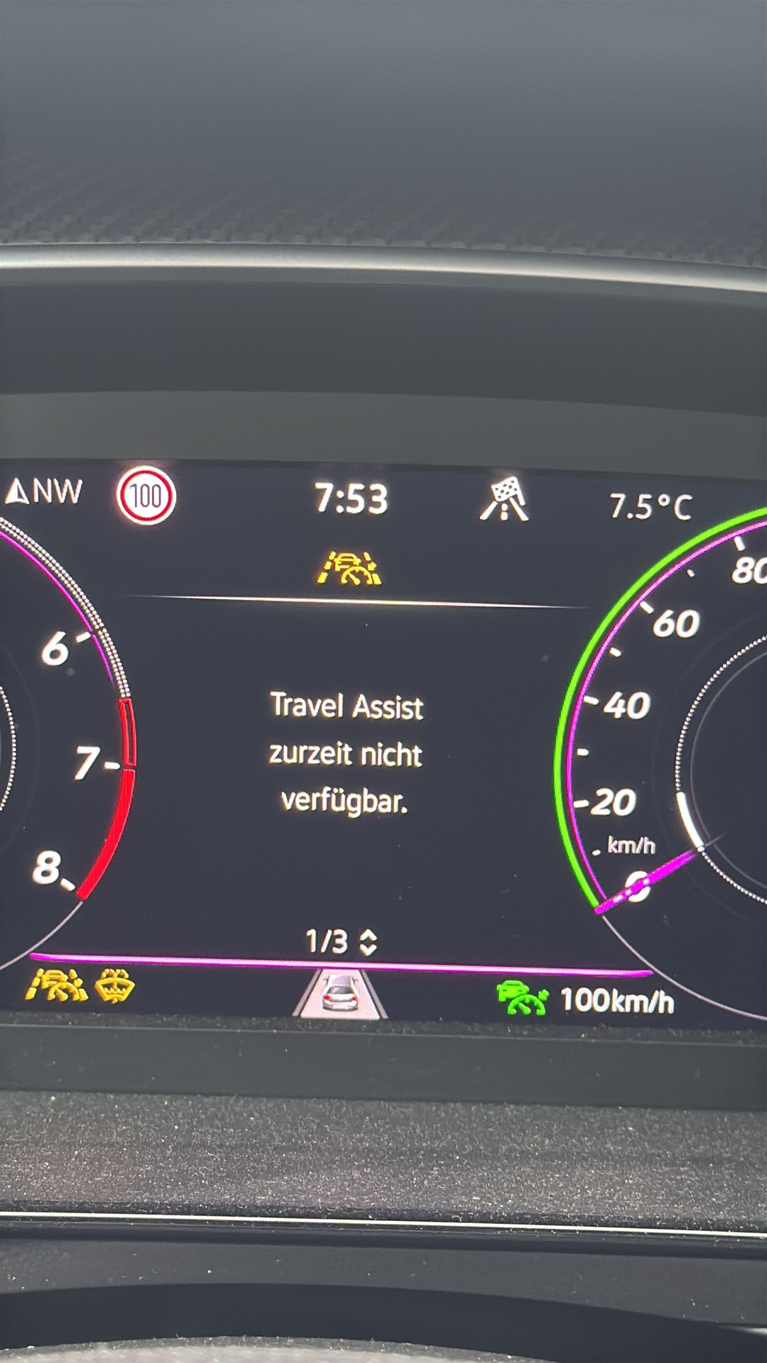 Das Problem liegt wohl doch bei kälteren Temperaturen, je kälter es wird, desto mehr zeigt der Travelassist inklusive ACC Probleme. In der Regel lagen die Temperaturen in den letzten Tagen in der Tiefgarage zwischen 5-9 Grad, und auf dem Weg zur Arbeit traten nur 1-2 Fehlermeldung auf. Gestern, als es schneite und die Temperaturen bei klirrender Kälte bei 0 Grad heute in der Tiefgarage lagen, leuchteten direkt nach dem Start auf dem Weg raus alle Warnleuchten auf. Auch mein Ausflug nach Dresden gestaltete sich bei -9 Grad in der Nacht ähnlich , hier stand das Auto vor abfahrt 8h draußen.