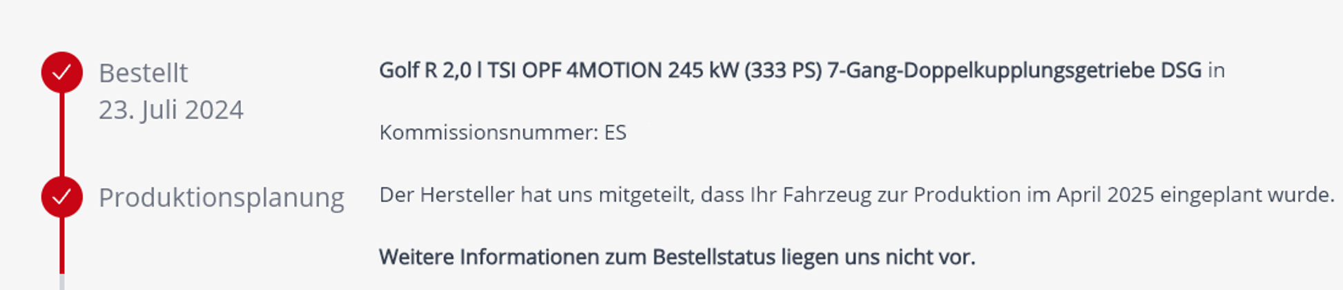 FirstGolfR ich stehe auch auf Bauzeit Ende April. Leider ist auch noch keine Produktionsplanung erfolgt. Habe auch die BE mit Warmenau-Felgen am 23.07.24 bestellt.