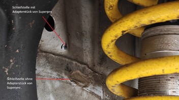 Die Kollision mit dem Chassis wurde dadurch ausgelöst, dass wir irrtümlicheweise auf der linken Seite den Superpro Adapter für das OEM Fahrwerk mit verbaut hatten. Also - raus mit dem Ding.