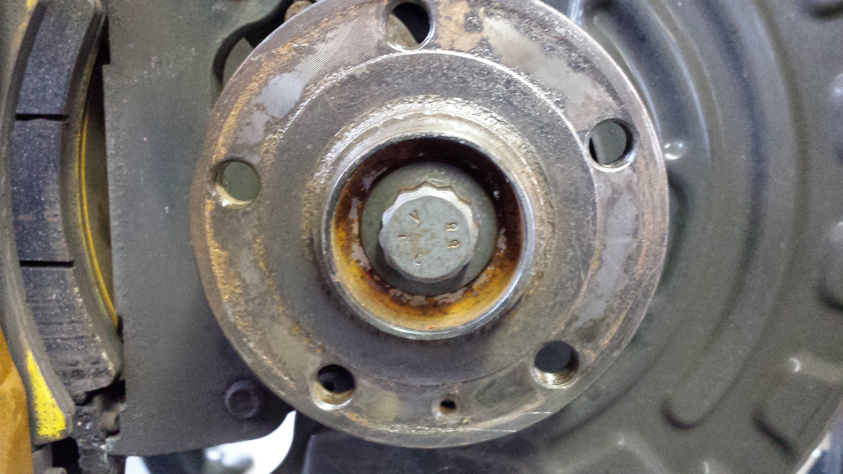 Die VW Radnaben scheinen qualitativ nicht besonders zu sein ( 3 Jahre alt und ca. 45.000 KM ) da schon total vergammelt. Auf dem Bild sieht man sie schon nachdem wir sie mit einer rotierenden Drahtbürste bearbeitet hatten. Die Bremsscheibe ging nur schwer ab und war richtig fest. So und nun zum Problem. Wie man auf dem Bild sieht ist die Nabe nicht ganz plan, somit kann der Bremstopf nicht komplett aufliegen. Das dürfte der rund sein warum nach harten Bremsmanövern und entsprechender Hitzeentwicklung die schwimmend gelagerten Scheiben anfangen zu "flattern" und auch die Bremsbeläge sich schräg abfahren können.