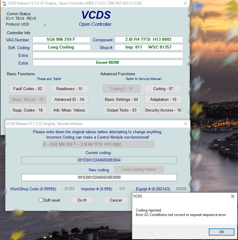 Bin mir nicht ganz sicher, aber das Steuergerät 5G0 906 250 F ist doch noch nicht ganz offen?! Noch keine 100%ige Berechtigung zum ändern der Werte & Co... Alle Angaben ohne Gewähr