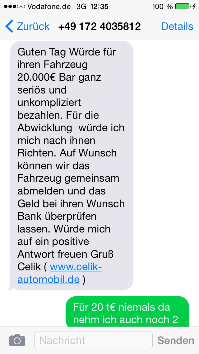 Nee ich gehe preislich nicht mehr großartig weiter runter , Montag war jemand da dessen Freundin reinredete sonst hätte er ihn genommen und jemand aus Essen hätte ich auch noch bei dem passte allerdings die Finanzierung nicht .