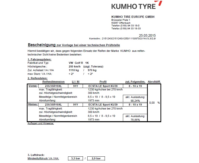 Meine Frage bezieht sich auf den Anhang, offizeill von Kumho erhalten für die den Reifen und Golf 6 R.