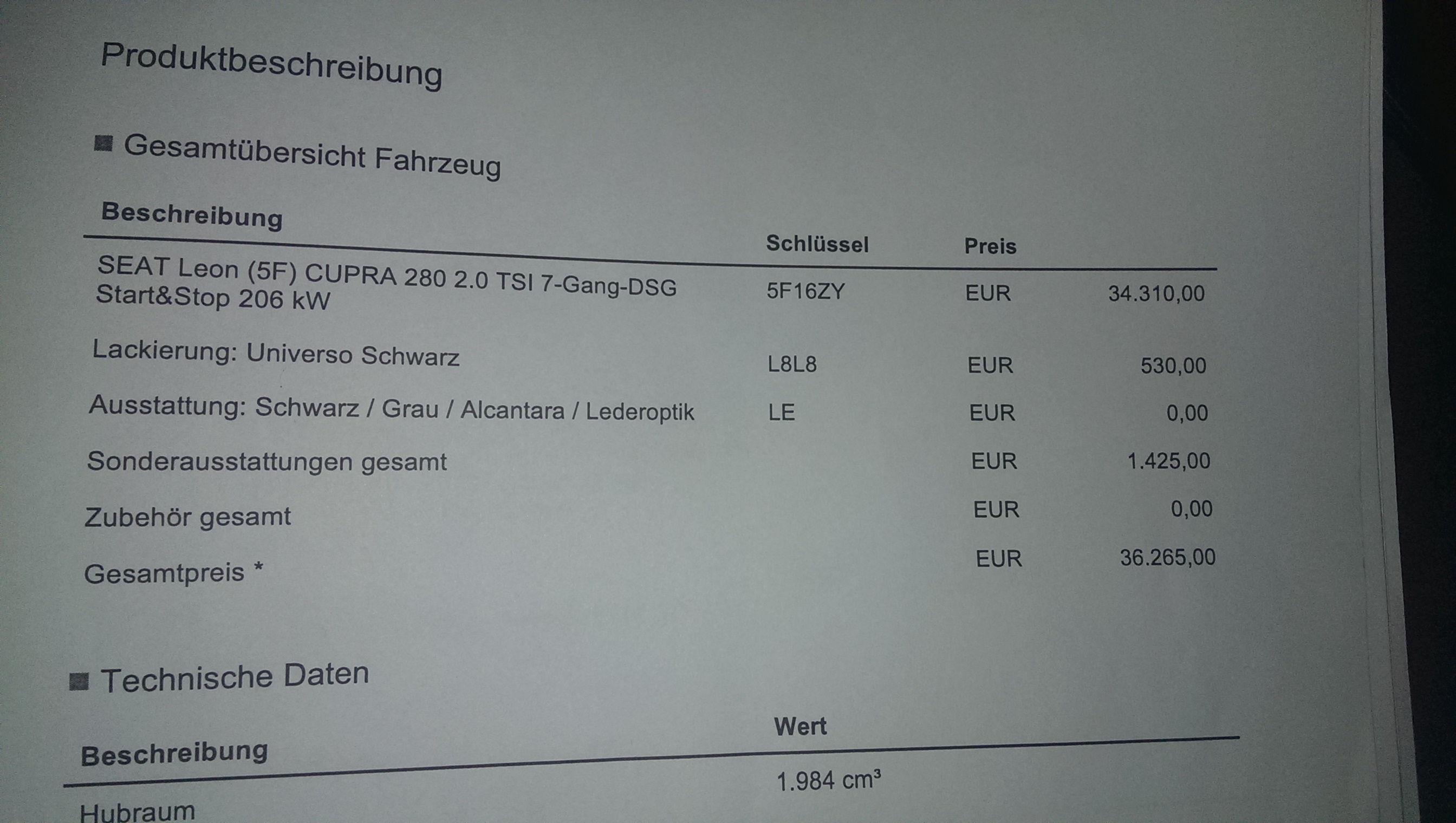 Ich zahle nun für den Cupra knapp 35K aber ich muss sagen ich hab einiges dabei.