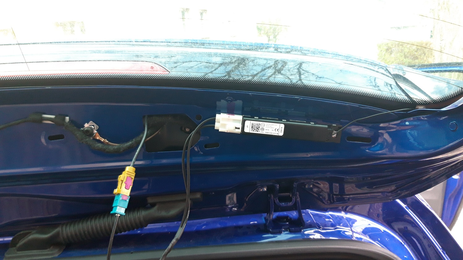 Wie zufor schon beschrieben das 5G6 035 577B rechts in die Heckklappe und dafür das AM raus .Anschliesen mit FAKRA Adapter das Kabel hatte bei mir die Beschriftung Ltg.2 ,
