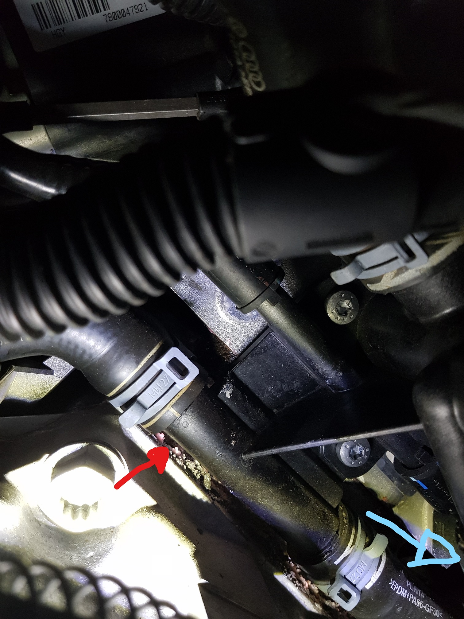 ich habe seit einigen Tagen an meinem R auch das Problem des Kühlwasserverlusts mit gerademal 40tkm. Nach Abstellen zeigt sich eine Pfütze unterm Motor, Garage reicht nach Frostschutz, im Zylinderkopf kein Schlamm und von den Abgasen her kein Qualm der auf verbrennendes Kühlwasser schließen lässt...habe Auto aufgebockt und nach undichten Stellen gesucht. Habe dann am Kopf hinten über dem Turbo Rückstände von Kühlwasser gefunden, ebenso an einem benachbarten Schlauch welcher vermutlich zum Wärmetauscher in Innenraum führt. Erste Vermutung war klar Zylinderkopfdichtung, aber habe die Ablagerungen entfernt und dann die Stelle mit Dichtpaste so gegen herunterlaufendes Kühlwasser isoliert um erkennen zu können woher das Wasser kommt. Nachdem ich den Motor wieder einige Zeit laufen lassen habe, zeigt sich dass das Kühlwasser von der linken Seite am Motorblock (wo der Schlauch hingeht) herunterläuft (Bild 1). Also entweder vom Schlauch bzw dem dranhängen Flansch oder doch der darüber liegenden Kopfdichtung auf der linken Seite des Blocks.