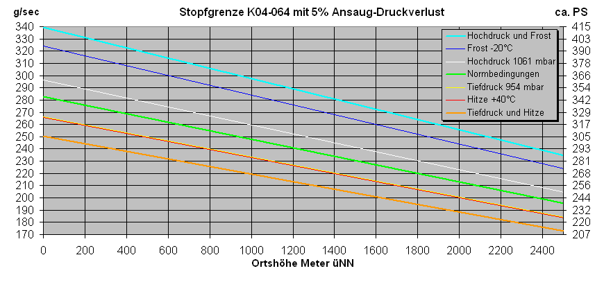 Ab 5000 rpm ist dann auch das N75-TV völlig festgetackert, und zwar auf 83%. Ungefähr dort beginnt auch das Luftmassen-Plateau von knapp 280 g/sec, das zusammen mit dem permanent sinkenden Ist-Ladedruck meinen Thread zur geometrischen Pmax-Begrenzung des K04-064 bestätigt. Dieses Tunefile kann daher überhaupt nicht mehr auf veränderte Umgebungsbedingungen (Luftdruck und -temperatur) reagieren, d.h. die Drehmomentkurve rauscht je nach Wetter und Höhenlage rauf und runter, so wie bei einem Saugmotor. Und das "tolle" Pmax-Plateau kommt ganz einfach daher, daß der Lader an seiner Stopfgrenze läuft, also restlos ausgequetscht wird.