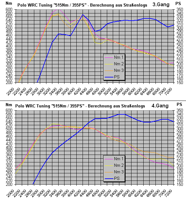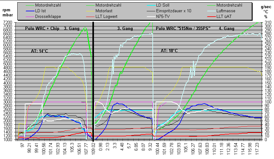 vor einger Zeit schickte mir jemand Logdaten eines Polo WRC aus seinem Bekanntenkreis mit 200 Zellen Kat, 3 Zoll-AgA, Upgrade-HPFP, HFI Carbon Air Intake Kit Gen. 2, Upgrade-Kupplung - und natürlich gemachter Software. Laut Tuner sollten es 515Nm und 355PS sein.