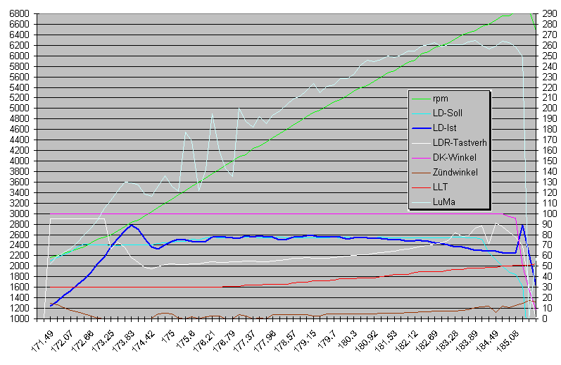 Ansonsten hat er sich mit über 160 geänderten Kennfeldern, Einzelwerten usw. reichlich ausgetobt. Zum Vergleich: Der Polo links im Logdiagramm hat gegenüber der Seriensoftware grade mal ca. 80 Änderungen. Für die Hardware-Upgrades des anderen Polo würden IMO ca. 5 zusätzliche Änderungen ausreichen, daher hat der Stage yx-Chipper hier wohl mit Dutzenden unnötigen Eingriffen mehr durcheinandergebracht als verbessert. Aber sobald Kennfelder z.B. "Ladedruck" im Namen tragen, muß man sie ja großzügig hochsetzen *lool*